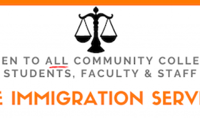 Graphic that reads: Open to ALL Community College Students, Faculty & Staff. Free Immigration services.